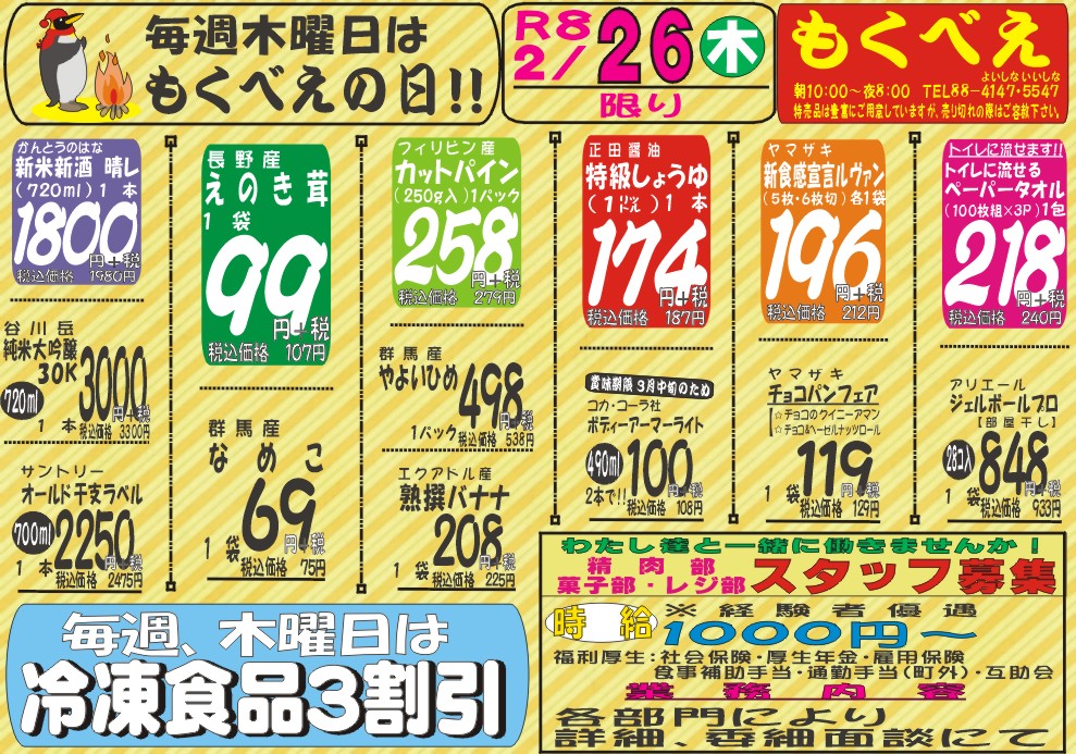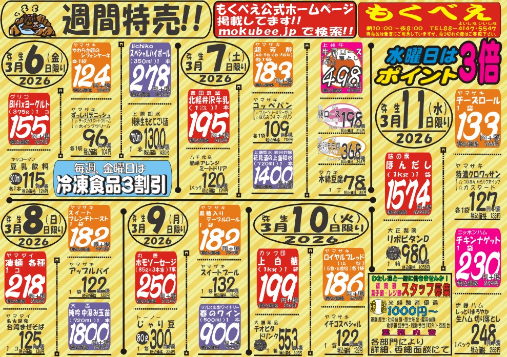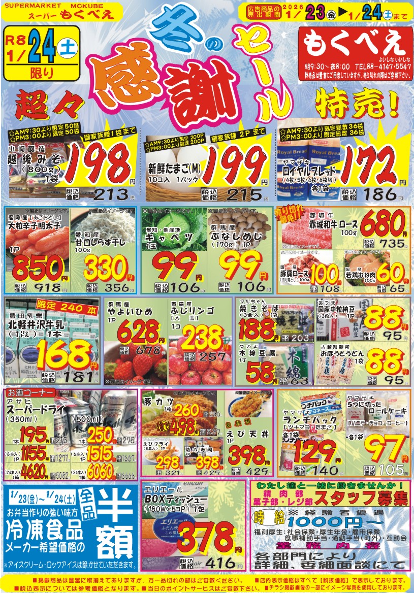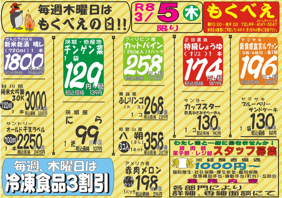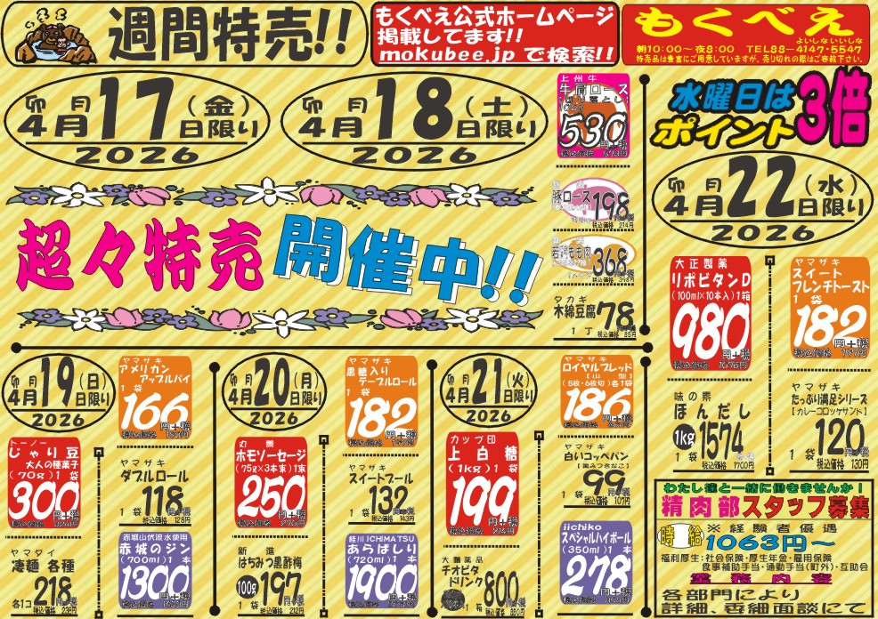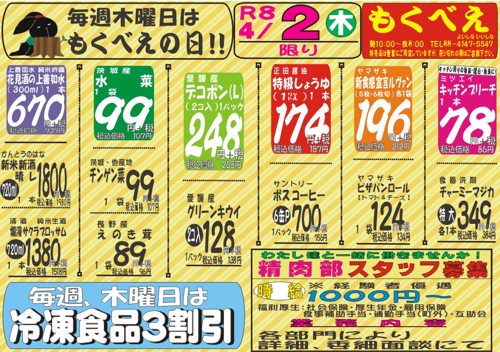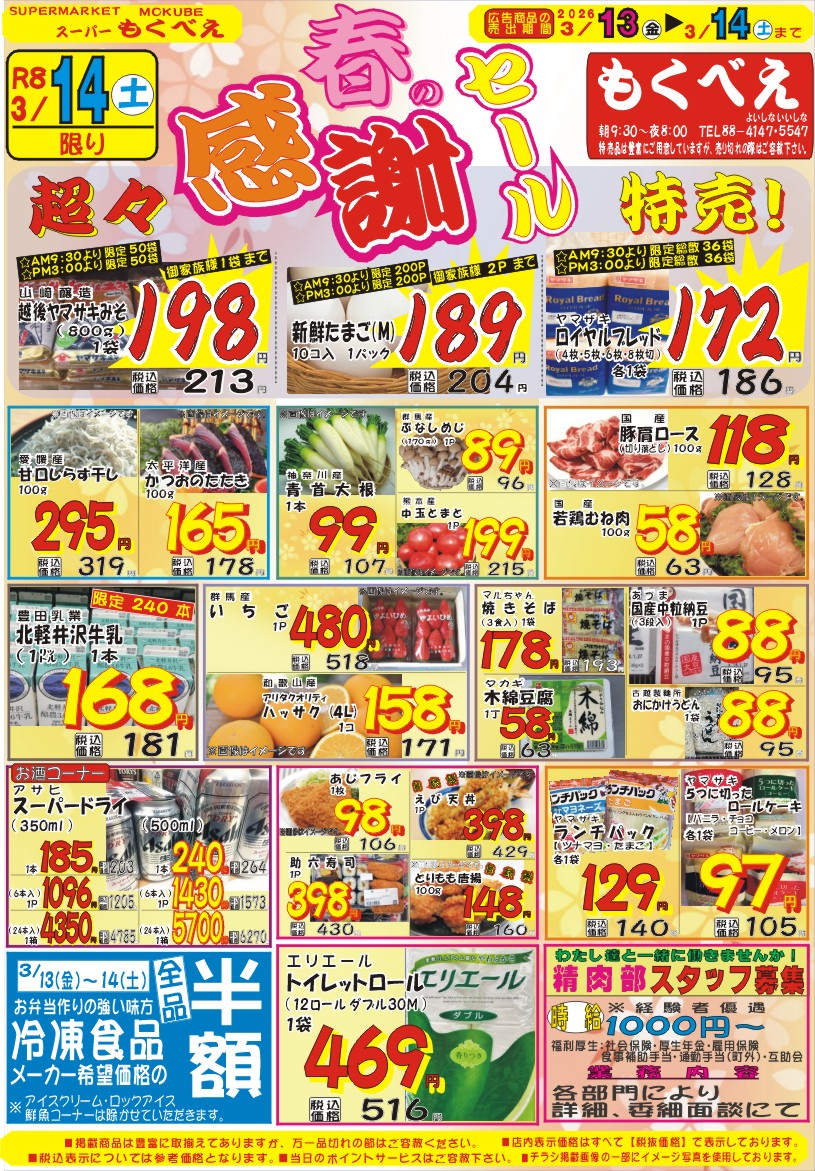 Super Mokubee is a community-based fresh food supermarket located in Kusatsu Onsen. Fresh ingredients are bargain every day. We also have various sundry goods.