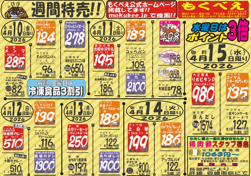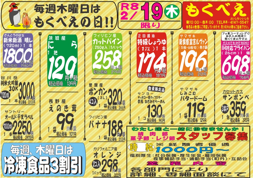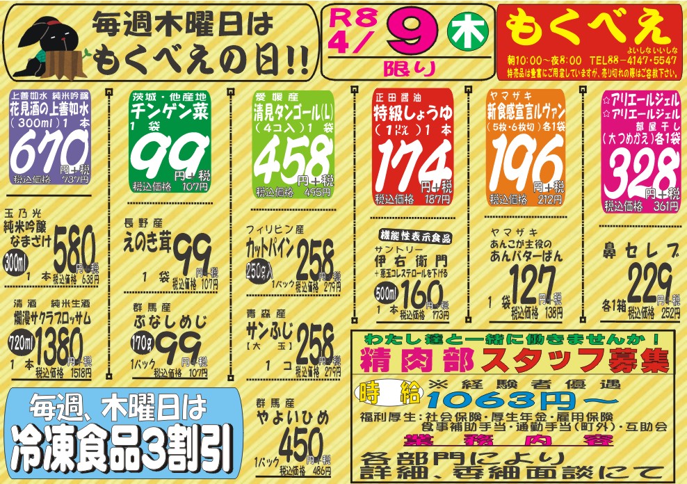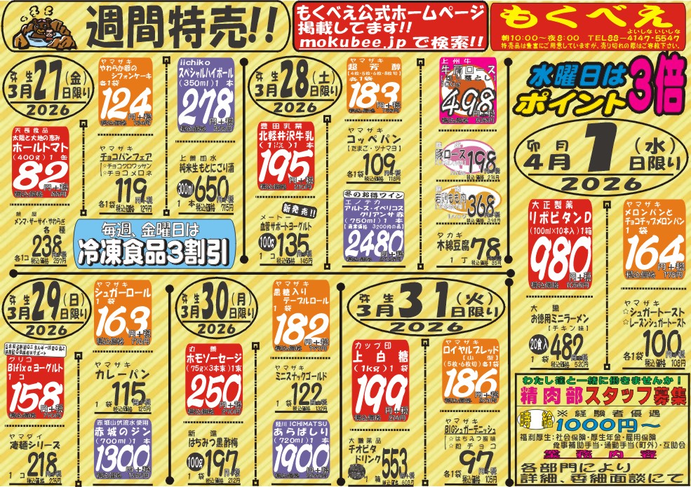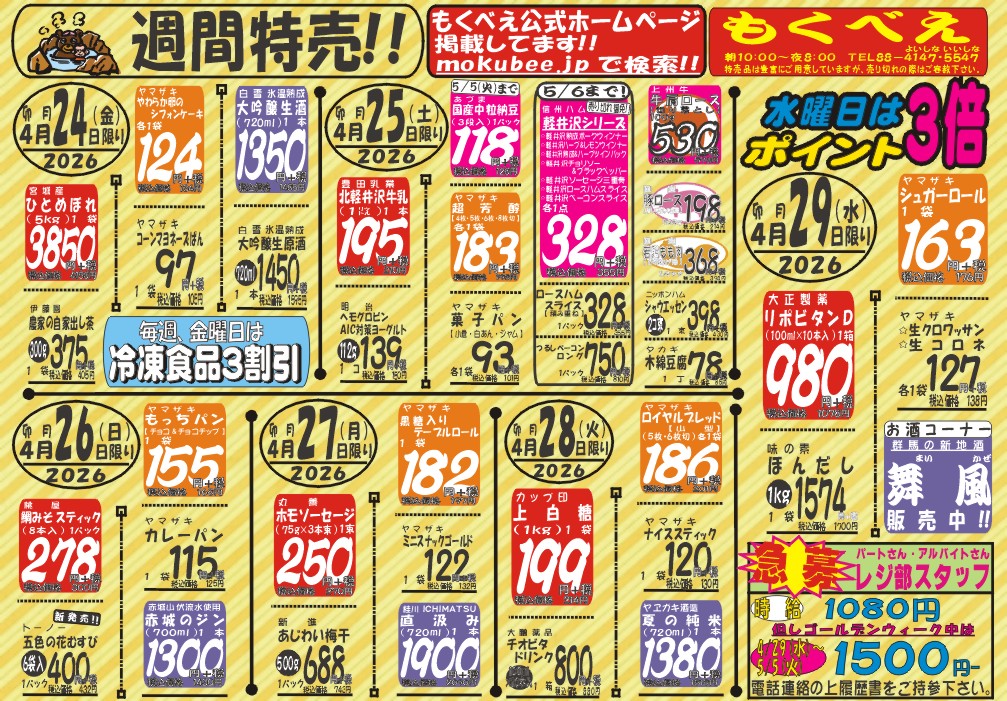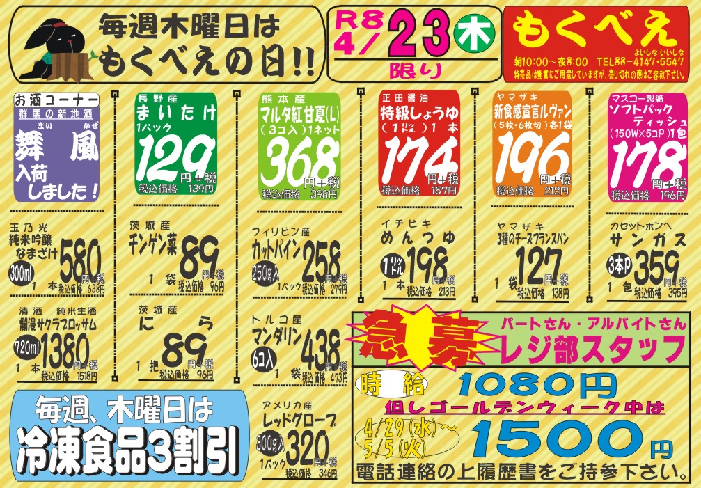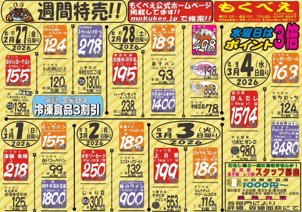 Super Mokubee is a community-based fresh food supermarket located in Kusatsu Onsen. Fresh ingredients are bargain every day. We also have various sundry goods.