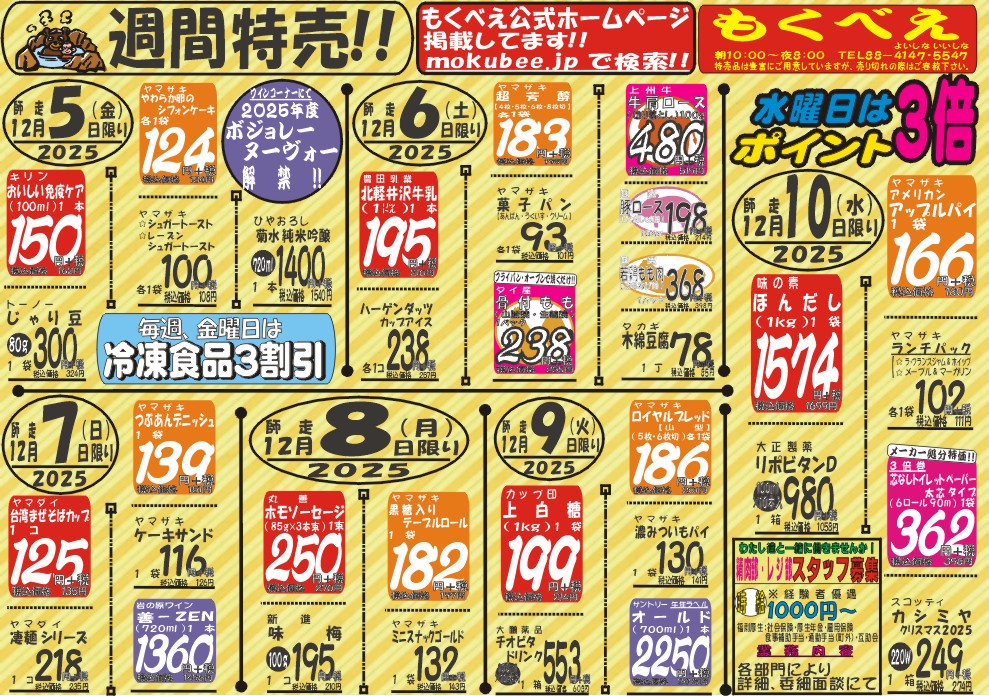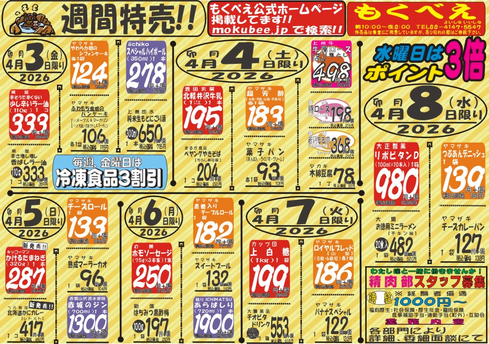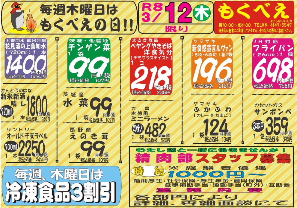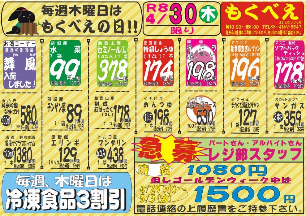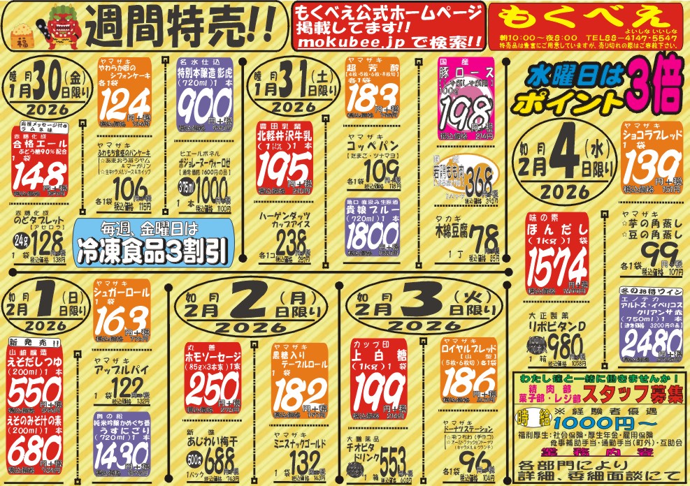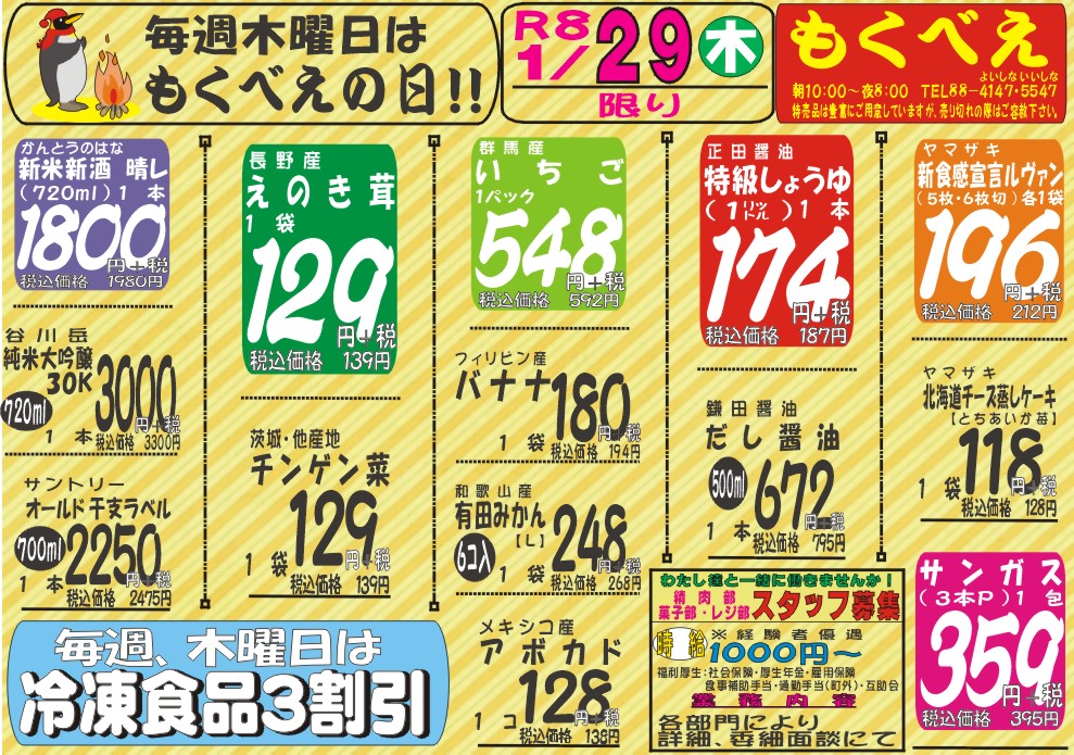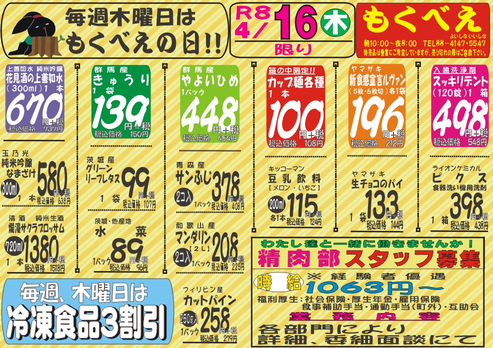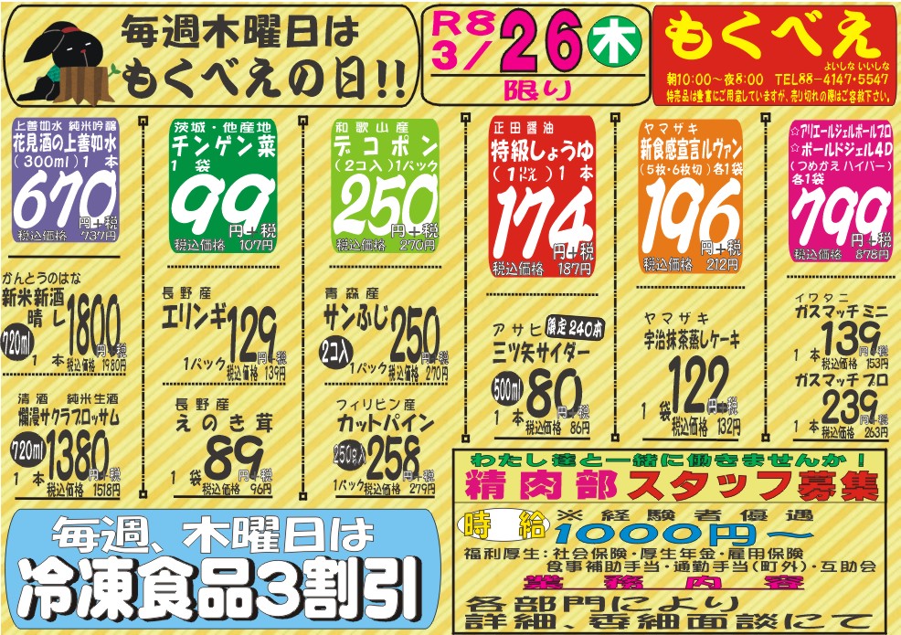 Super Mokubee is a community-based fresh food supermarket located in Kusatsu Onsen. Fresh ingredients are bargain every day. We also have various sundry goods.