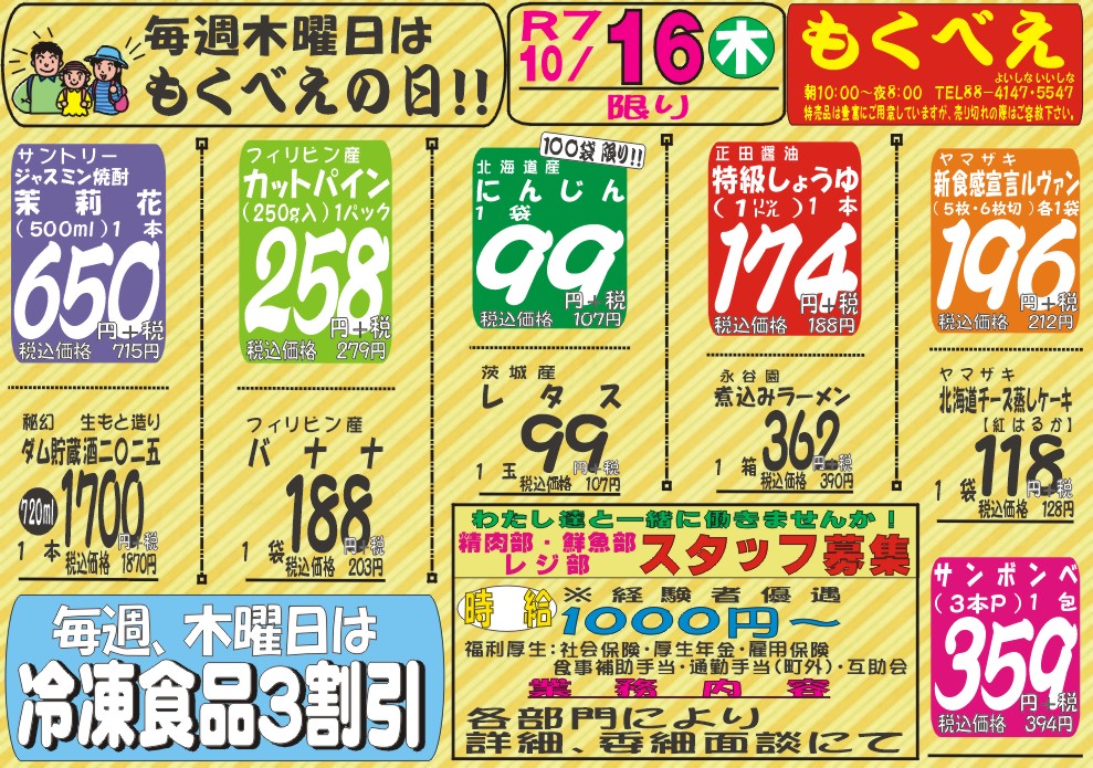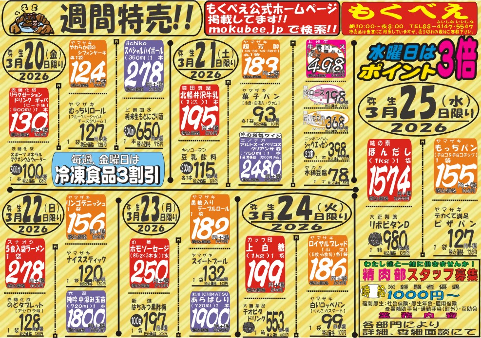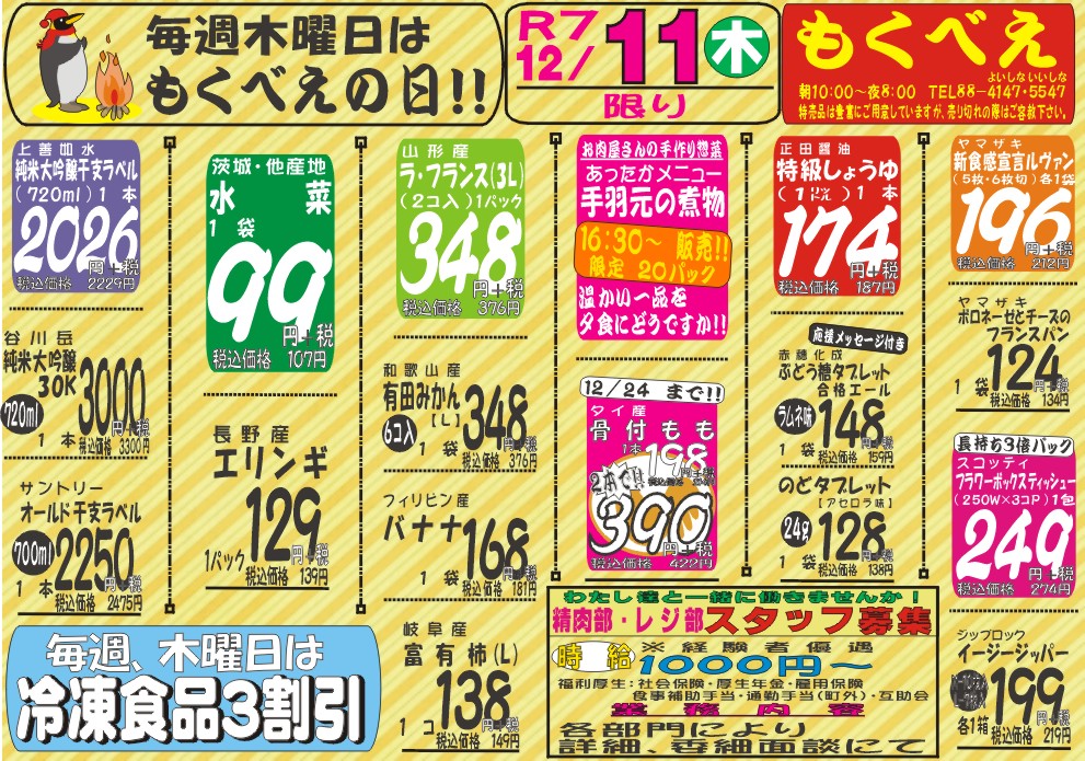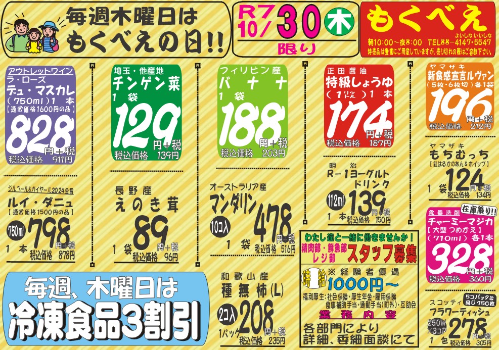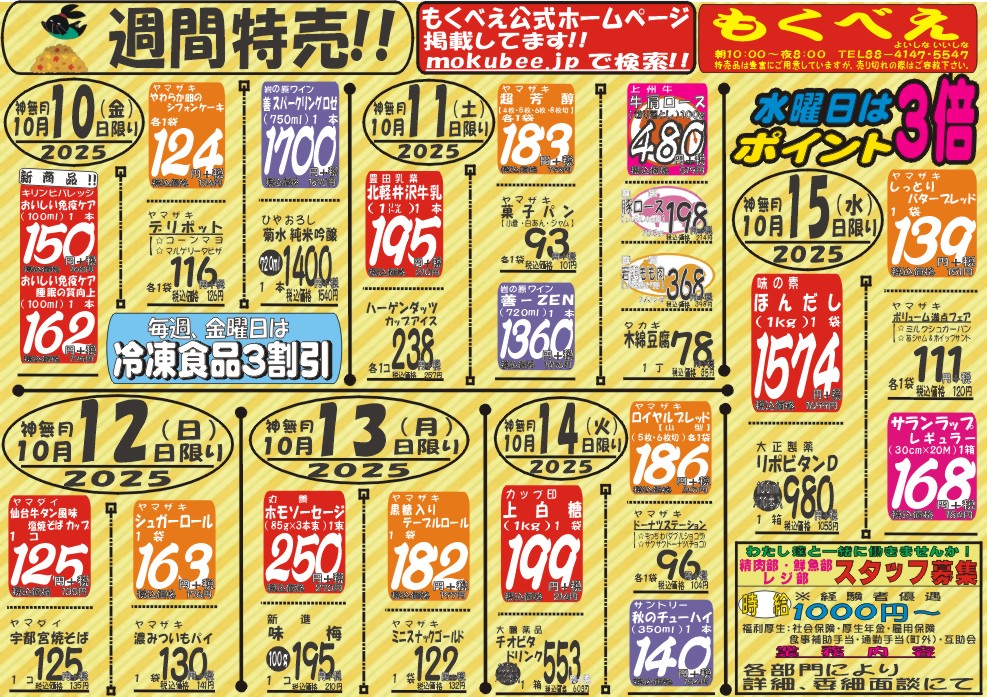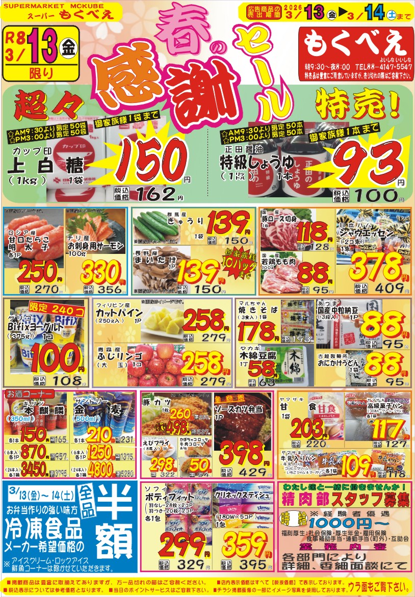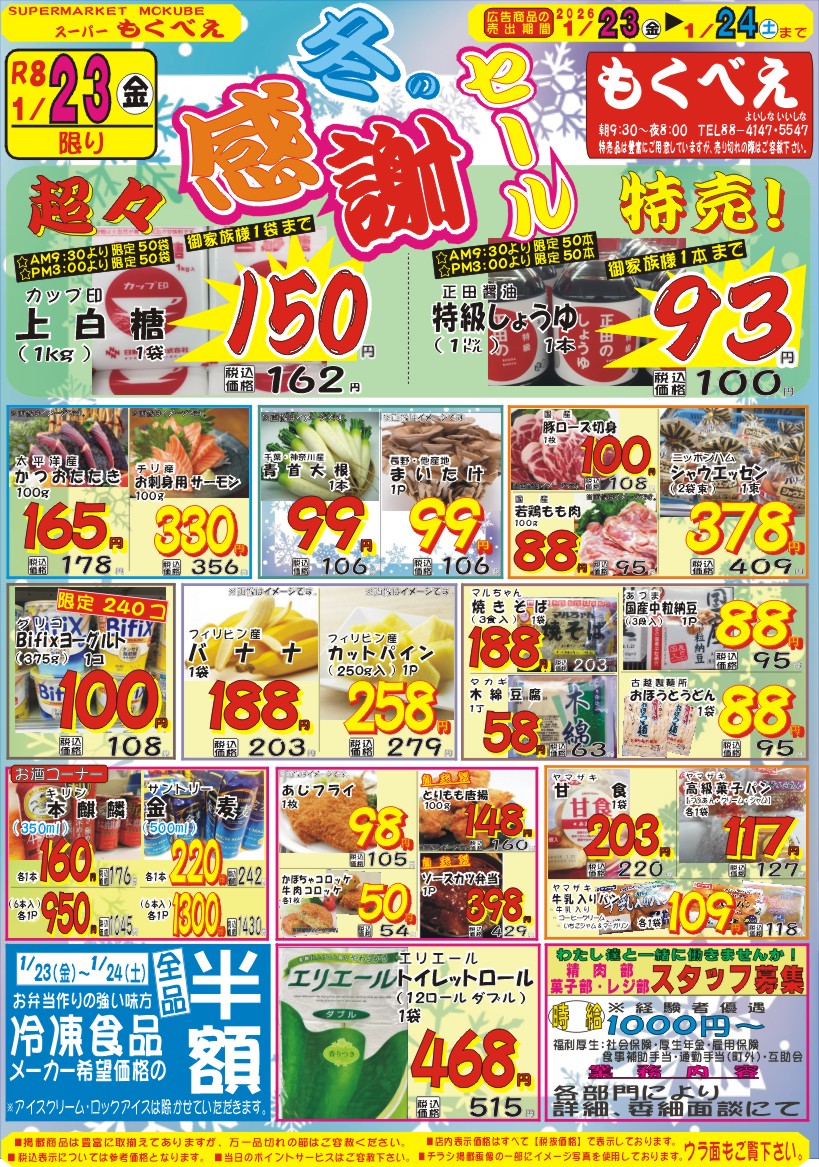 Super Mokubee is a community-based fresh food supermarket located in Kusatsu Onsen. Fresh ingredients are bargain every day. We also have various sundry goods.